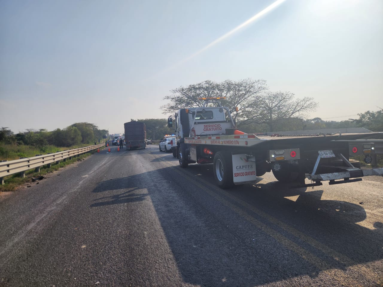 Altamira, Tamaulipas.– La circulación se encuentra suspendida en ambos sentidos en la Carretera Federal 70, a la altura del kilómetro 12 del Libramiento Tampico, tras registrarse un choque entre un automóvil y un tráiler con doble remolque.