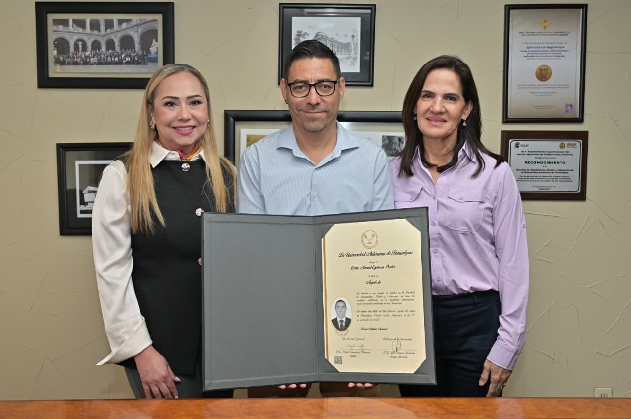 Hoy, Carlos no solo celebra su título. Acompañado de su esposa, Adriana Álvarez Gómez, y de la Dra. Keyla Doria Betancourt, Subdirectora del Centro de Rehabilitación Integral (CRI), Carlos se convierte en el primer graduado sordo en la historia de la UAT.