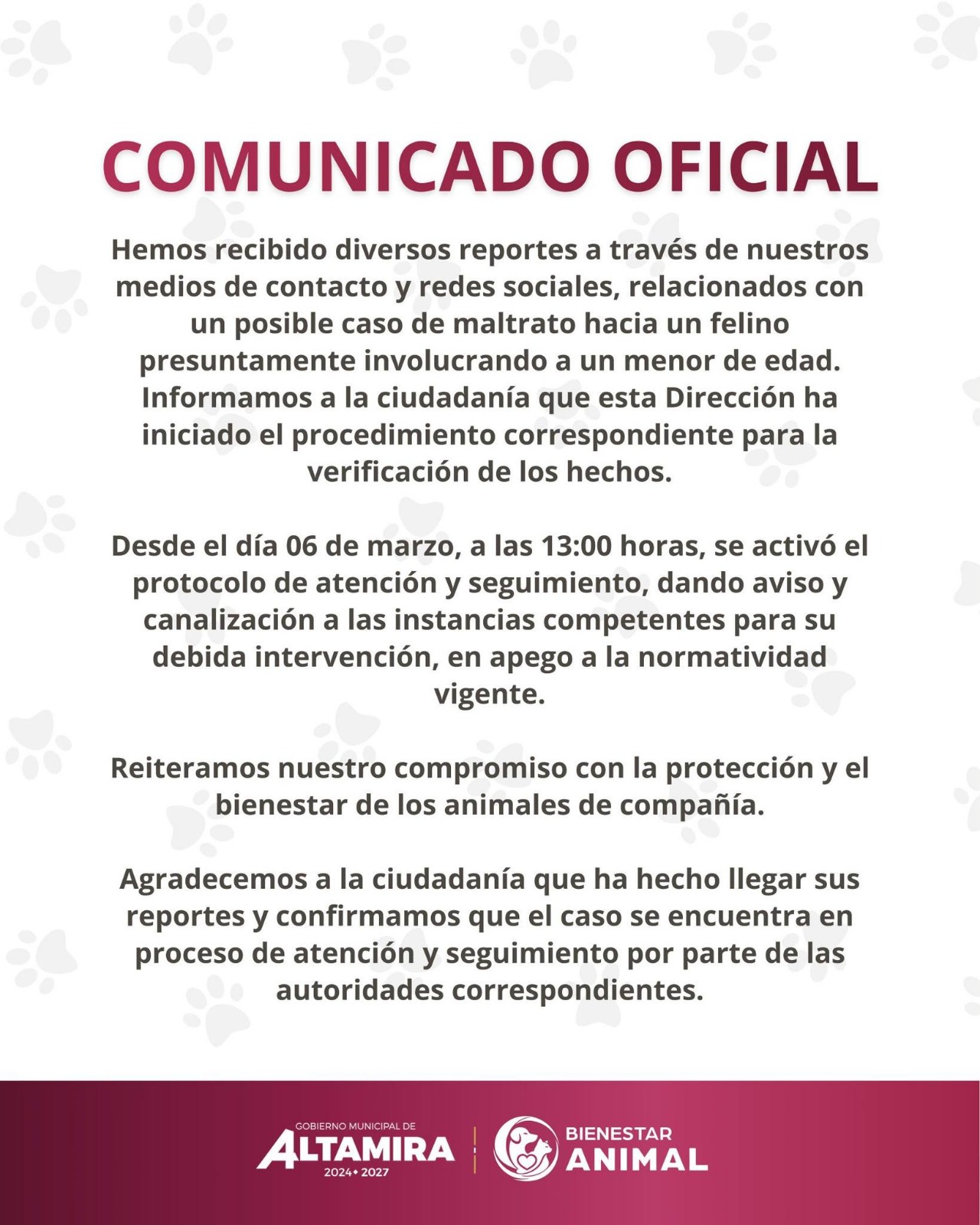Ciudad Altamira, Tamps.- La Dirección de Bienestar Animal del Gobierno Municipal de Altamira informó que activó un protocolo de atención y seguimiento luego de recibir diversos reportes ciudadanos relacionados con un posible caso de maltrato hacia un felino, presuntamente vinculado con la participación de un menor de edad.