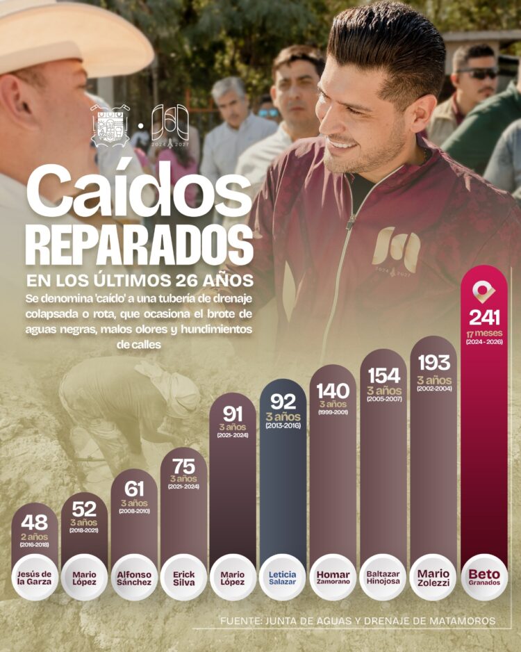 El alcalde Beto Granados afirmó que su administración ha superado ampliamente las metas de reparación de caídos en Matamoros y que para este año 2026 se busca alcanzar más de 300 caídos rehabilitados, además de continuar con obras de agua potable y saneamiento.