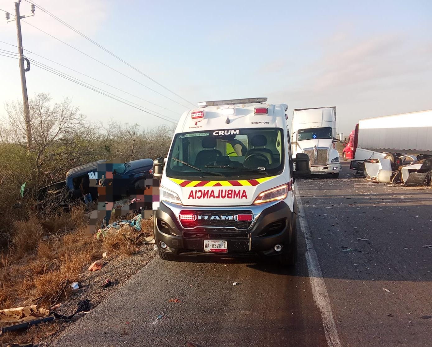 Jiménez, Tamaulipas.- Derivado de un accidente vehicular con personas lesionadas, la circulación vial se encuentra cerrada en tres carriles de la Carretera Federal 101 Victoria-Matamoros.