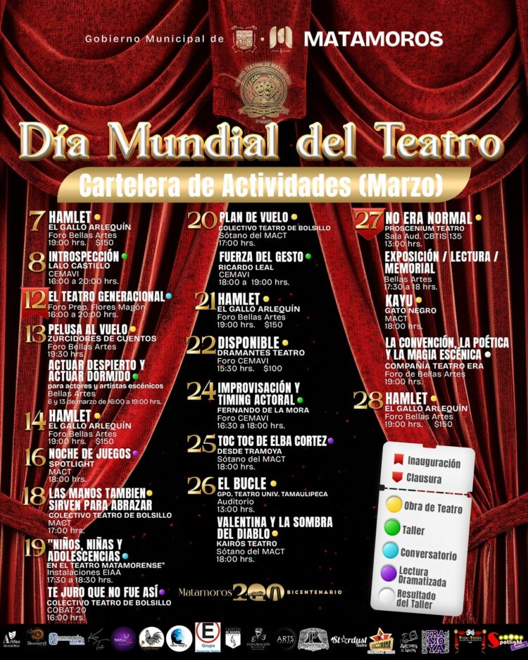 Las actividades incluyen talleres y presentaciones teatrales cuya cartelera se dará a conocer por separado. La clausura del programa está prevista para el 27 de marzo, fecha en la que se conmemora oficialmente el Día Mundial del Teatro. Con ello, Matamoros reafirma su posición como uno de los municipios con mayor actividad teatral y cultural en el estado.