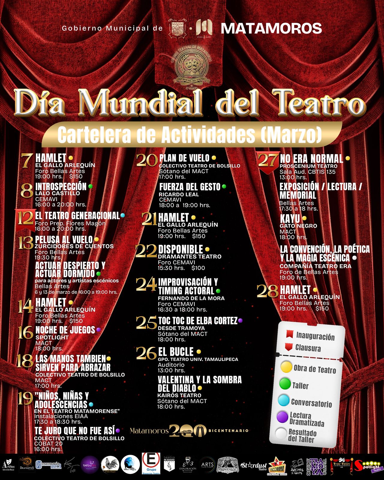Las actividades incluyen talleres y presentaciones teatrales cuya cartelera se dará a conocer por separado. La clausura del programa está prevista para el 27 de marzo, fecha en la que se conmemora oficialmente el Día Mundial del Teatro. Con ello, Matamoros reafirma su posición como uno de los municipios con mayor actividad teatral y cultural en el estado.