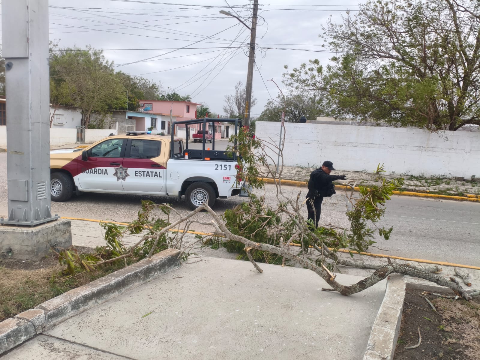 En el municipio de Aldama detectaron afectaciones cerca del parque de béisbol “Efraín de Leija Vargas”, ocasionadas por ramas y troncos que obstruían la circulación vehicular, situación que representaba un riesgo para automovilistas.