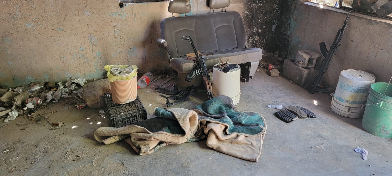 El predio se encontraba rodeado por maleza, al inspeccionar su interior, se encontraron dos armas largas con un cargador insertado y cartuchos útiles, cargadores metálicos desabastecidos y artefactos metálicos denominados ‘’ponchallantas’’.