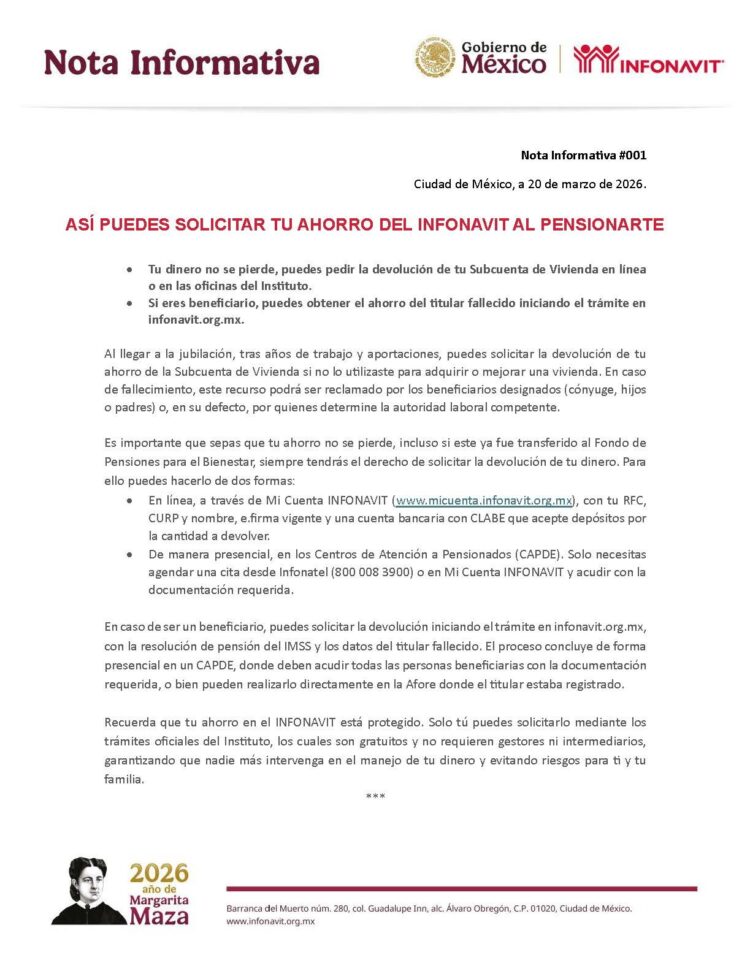 – Si eres beneficiario, puedes obtener el ahorro del titular fallecido iniciando el trámite en infonavit.org.mx.