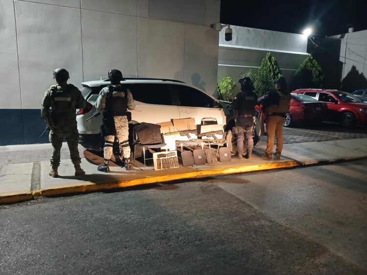 El vehículo fue encontrado en la Zona Centro con las puertas semiabiertas, al inspeccionarlo, se encontró en su interior dos chalecos tácticos con cuatro placas balísticas, dos armas largas, siete cargadores y 59 municiones, los cuales fueron puestos a disposición de la Fiscalía General de la República (FGR).