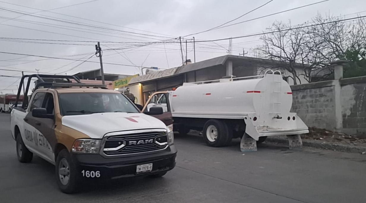 Reynosa, Tamaulipas.- Personal de la Guardia Estatal aseguró un vehículo tipo pipa presuntamente involucrado en el derribo de un poste de cámaras de videovigilancia en Reynosa.
