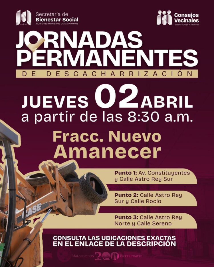Hoy jueves 02 de abril, a partir de las 8:30 a.m., las Jornadas Permanentes de Descacharrización llegan al Fraccionamiento Nuevo Amanecer, con puntos de recolección habilitados para facilitar la disposición adecuada de objetos en desuso.