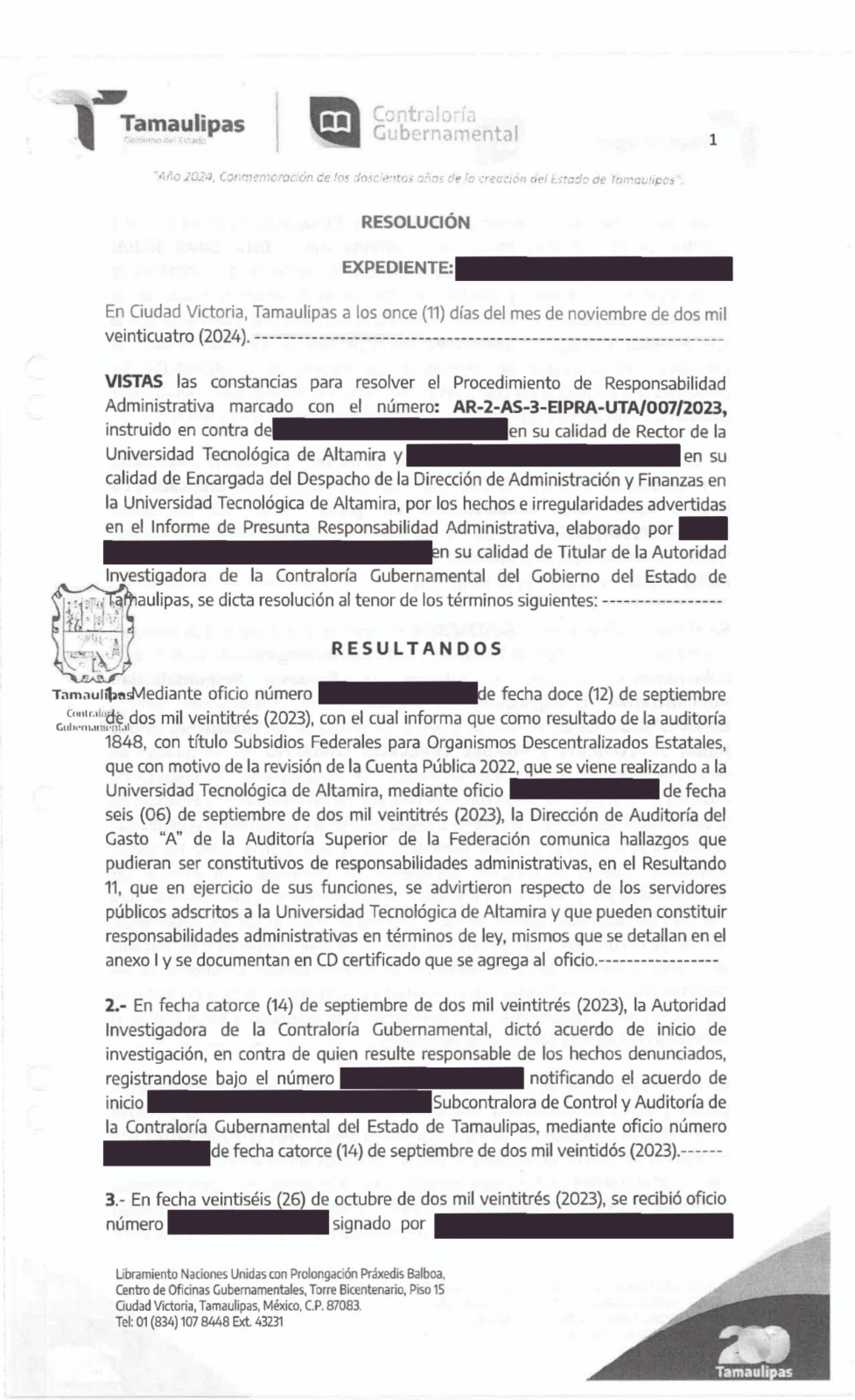 El caso se originó en 2023, cuando se detectaron posibles irregularidades en la administración de recursos públicos en la UT Altamira, institución dependiente del sistema de educación tecnológica del estado. A partir de ahí, se inició una investigación administrativa que derivó en la integración formal del expediente.