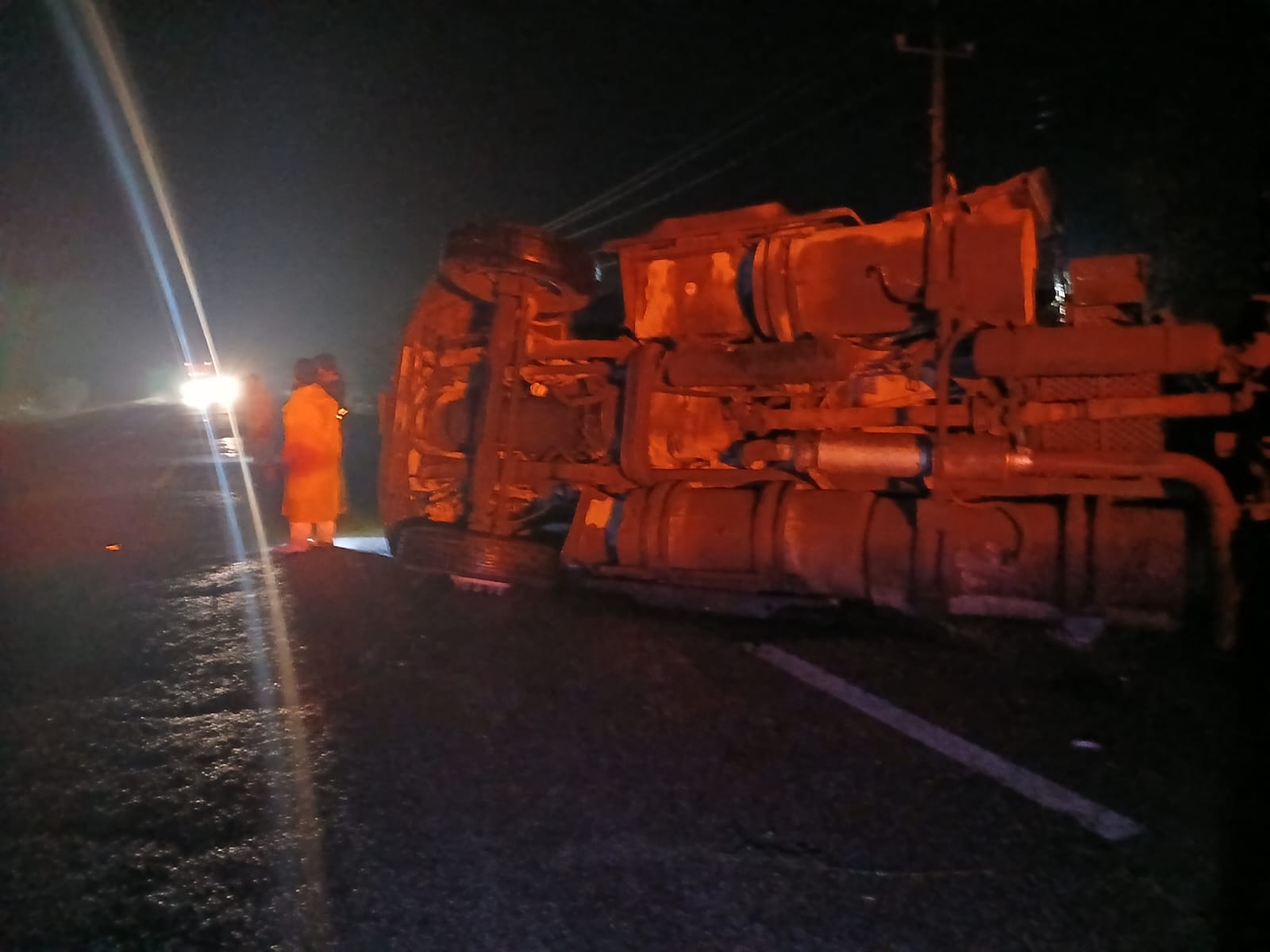Xicoténcatl, Tamaulipas.- Derivado de la volcadura de un tractocamión, la circulación se encuentra cerrada en un carril de la Carretera Estatal 116.