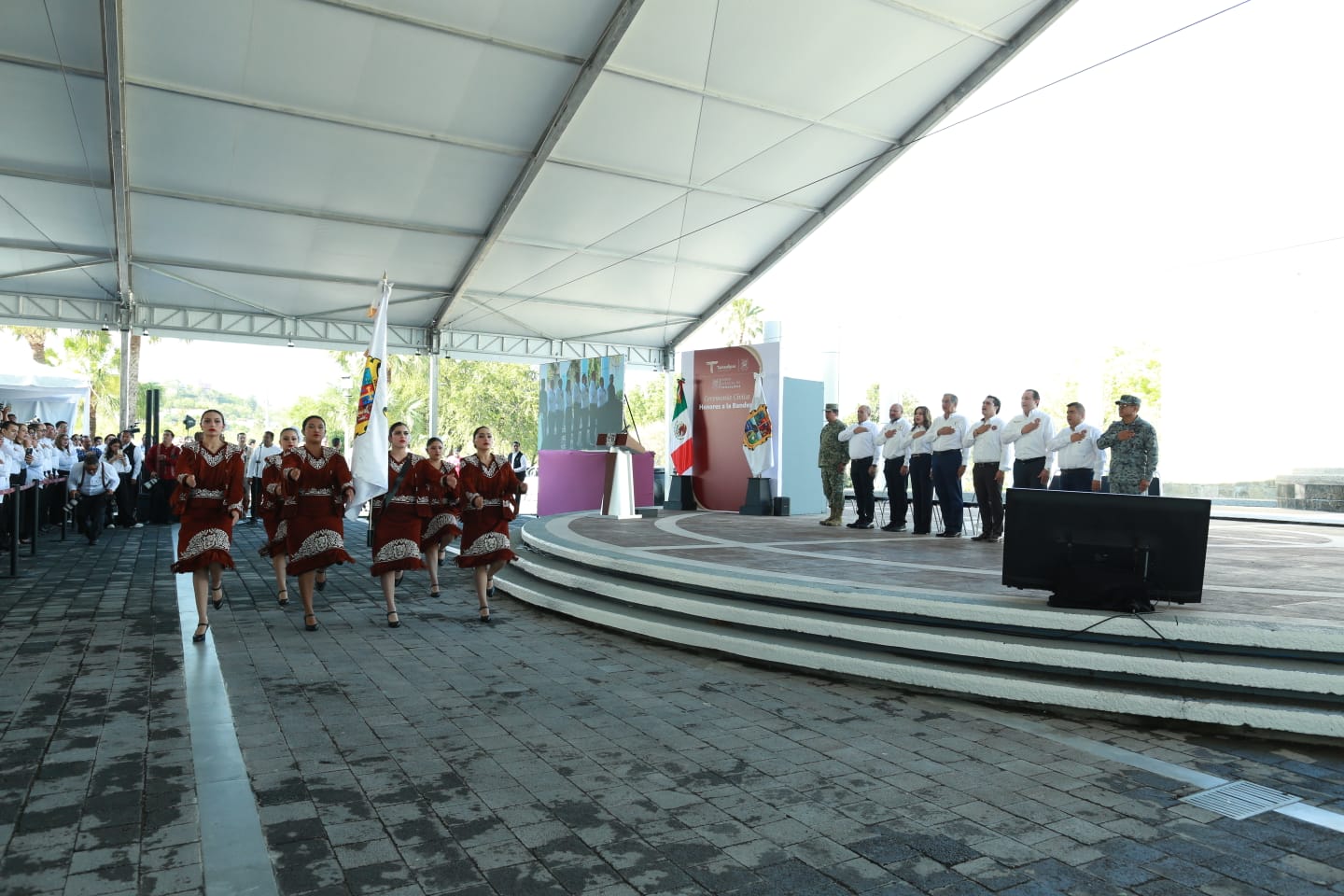 Al presidir la ceremonia de honores en la explanada del Supremo Tribunal de Justicia, frente al monumento a Benito Juárez y acompañado por la magistrada presidenta Tania Contreras López, el gobernador destacó la nivelación salarial que impacta al 85% de las y los trabajadores del Poder Judicial, con incrementos que van desde el 22% hasta por arriba del 100% en algunas posiciones que estaban muy rezagadas.