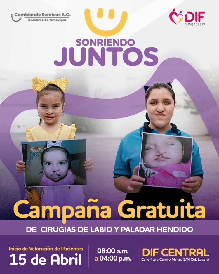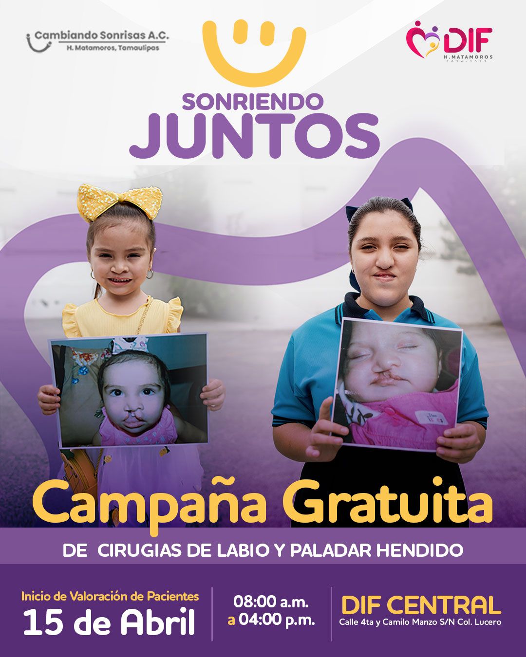 Trabajando bajo una visión de responsabilidad social y con el firme compromiso de mejorar la calidad de vida de las familias, el Sistema DIF Matamoros, presidido por la Lic. Ana Ariceaga de Granados, en coordinación con la Asociación “Cambiando Sonrisas”, da inicio a la etapa de valoración de la campaña permanente de cirugías de labio y paladar hendido “Sonriendo Juntos”, invitando a la población a beneficiarse con estas acciones.