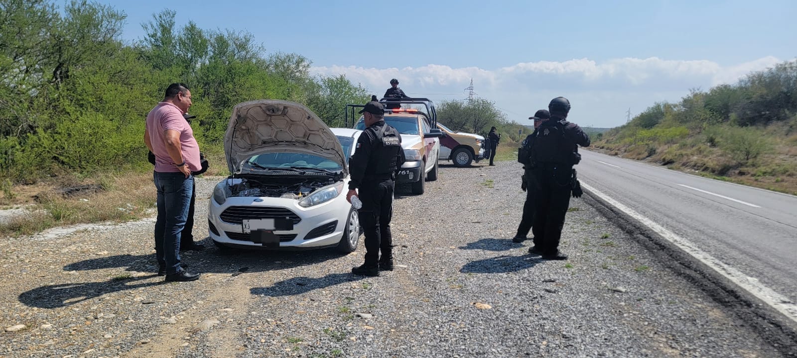 Padilla, Tamaulipas.– Personal de la Guardia Estatal brindó apoyo a un automovilista que sufrió una falla mecánica mientras circulaba por el kilómetro 55 de la Carretera Federal 101, en el tramo Ciudad Victoria–Santander Jiménez.