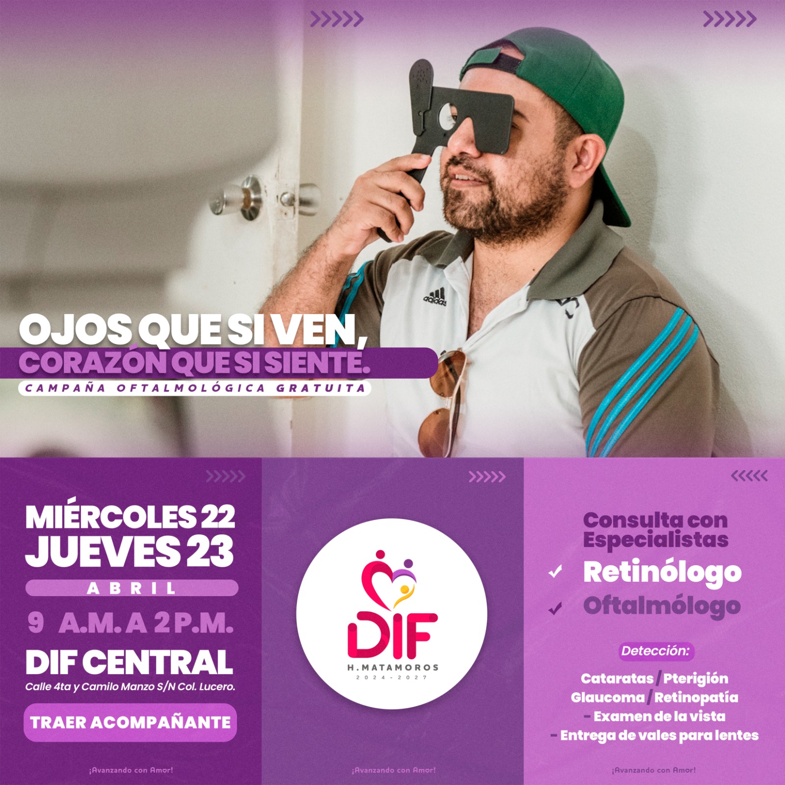 Dando seguimiento a las acciones que promueven el cuidado visual, el Sistema DIF Matamoros que preside la Lic. Ana Ariceaga de Granados, invita a la comunidad a formar parte de la Campaña Oftalmológica “Ojos que si ven, corazón que sí siente”; jornada que se realiza en coordinación con médicos especialistas para ofrecer una atención oportuna en la detección de afecciones oculares.
