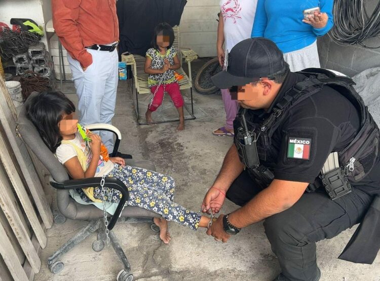 Una de las niñas fue encontrada con una cadena metálica rodeando su pie derecho y asegurada con un candado.
