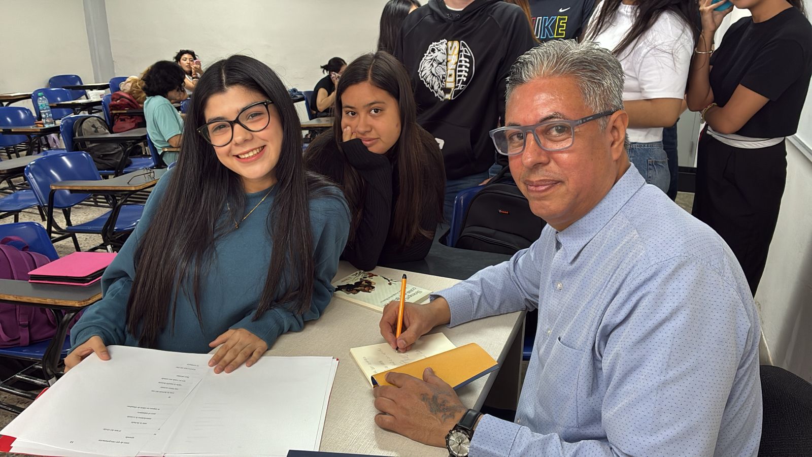 El autor realizó un diálogo con el alumnado del grupo E, donde imparte clases el maestro Carlos Cortéz, quien lo invitó a presentarse ante los estudiantes.