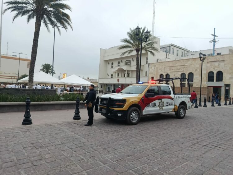 Reynosa, Tamaulipas.- Personal de la Guardia Estatal mantiene presencia en la Plaza Principal de Reynosa, luego de que se registrara una manifestación pacífica protagonizada por alrededor de 100 personas, en su mayoría adultos mayores, quienes se congregaron frente a la Presidencia Municipal.