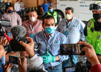 El alcalde de Nuevo Laredo, Enrique Rivas, llevó el operativo de sanitización a las centrales de autobuses, para disminuir el...