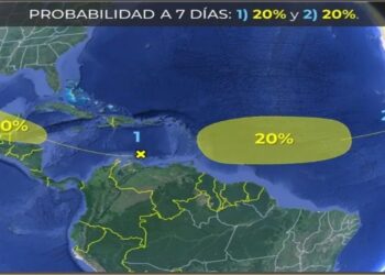 Una zona de baja presión asociada con una onda tropical se formó en el sureste del Mar Caribe, con 10 por ciento de...
