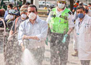 El presidente municipal de Nuevo Laredo, Enrique Rivas, encabezó los trabajos de desinfección de plazas públicas de este municipio