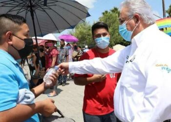 El presidente municipal de Nuevo Laredo, Arturo Sanmiguel Cantú, se presentó en el Centro Cívico para llevar agua a los...