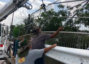 Este martes, personal de la Secretaría de Obras Públicas retiró 120 metros de malla que colgaba del puente de la...