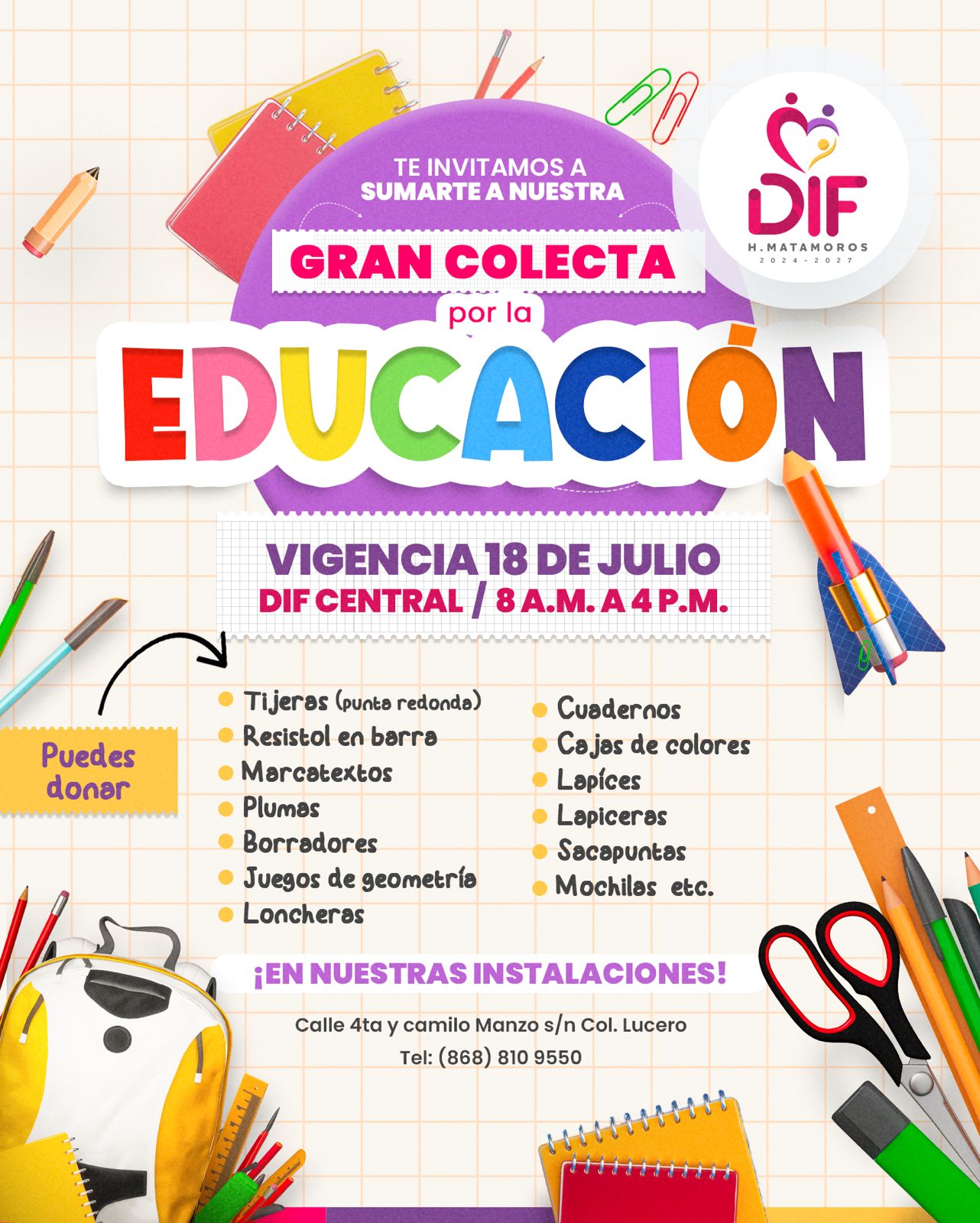 Lanza DIF Matamoros Campaña de Recolección de Útiles Escolares en beneficio a las niñas y niños en situación vulnerable